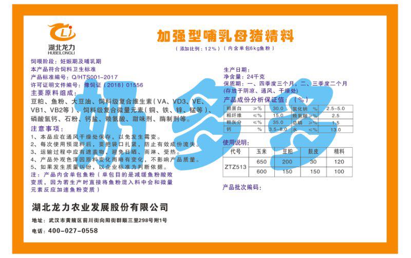 湖北龍力農(nóng)業(yè)發(fā)展股份有限公司坐落于武漢市黃陂區(qū)前川街向陽(yáng)街群順三里298號(hào)附1號(hào)。公司成立于2014年6月,公司自成立以來(lái)把“創(chuàng)全球最大養(yǎng)豬綜合服務(wù)”為企業(yè)愿景。致力于打造教保料品牌”作為公司發(fā)展的明確目標(biāo)。公司一直致力于豬營(yíng)養(yǎng)的研究和開發(fā),積極與國(guó)內(nèi)外高校和科研機(jī)構(gòu)合作,推廣養(yǎng)豬技術(shù)、動(dòng)物營(yíng)養(yǎng)新概念,向世界農(nóng)牧企業(yè)學(xué)習(xí)與合作。公司采用國(guó)內(nèi)先進(jìn)的生產(chǎn)工藝,選擇高精度電子配料秤,高均勻度、無(wú)殘留混合機(jī)等先進(jìn)設(shè)備....